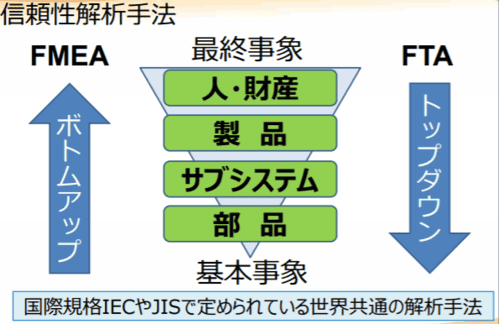機器、部品の機能上の品質影響が大きい問題を発生させる要因、そしてそれらの原因がどこに潜んでいるか、機器や部品の故障モードのデータを抽出すること、そしてそれらの故障モードが起きる発生時のサブシステム,システムの品質上の影響をワークシートを使うことにより重要な故障モードを摘出する手法。「ボトムアップ手法」といわれることもあります。