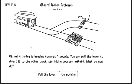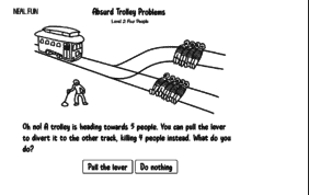 最初は、「オーノー!トロッコが5人に向かって走ってきます。レバー(ポイント切替器)を引けば線路のルートを切り替えることができます、が、その場合は別の人が1人死にます。どうする?」という、トロッコ問題の基本形。